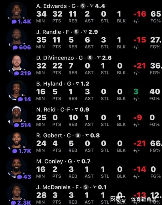 再说说今天全场最闪亮的“奇葩之星”——华子。20投13中,罚球3中2,砍下32分11板2助,可这失误数也高达8次,一个后卫交出这样的数据,让人又爱又恨。不过话说回来,输球这事儿也不能全怪华子,他那群队友们也得好好反思反思。森林狼这问题到底出在哪儿呢?上赛季还被吹嘘这套阵容潜力无限,毕竟连续两年都杀进了西决,可现在呢,眼看着又要走上重建的“老路”了。